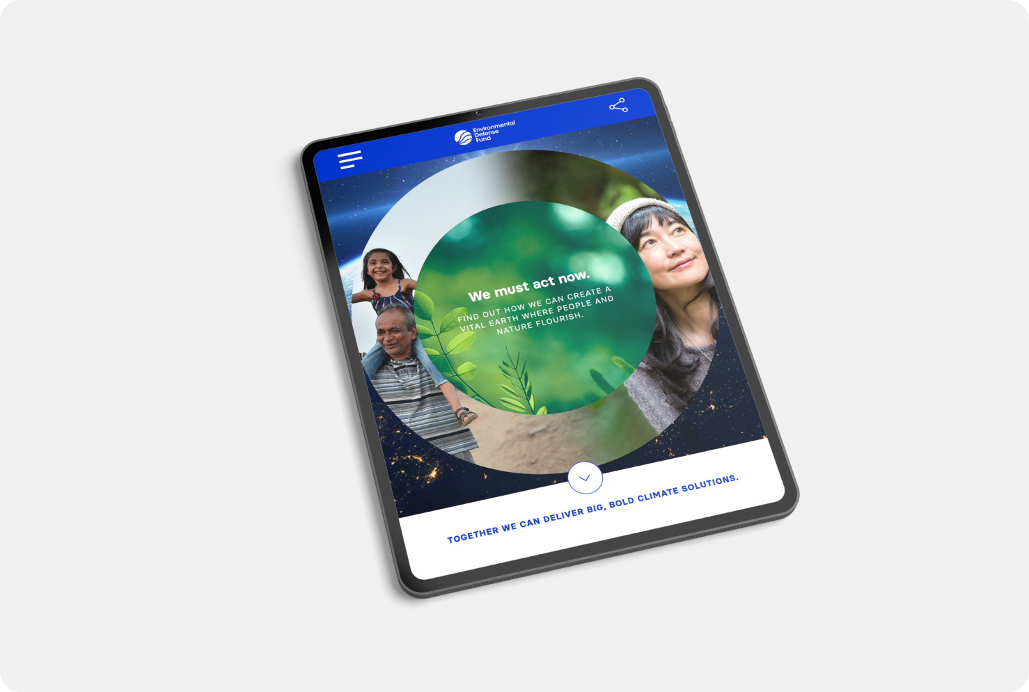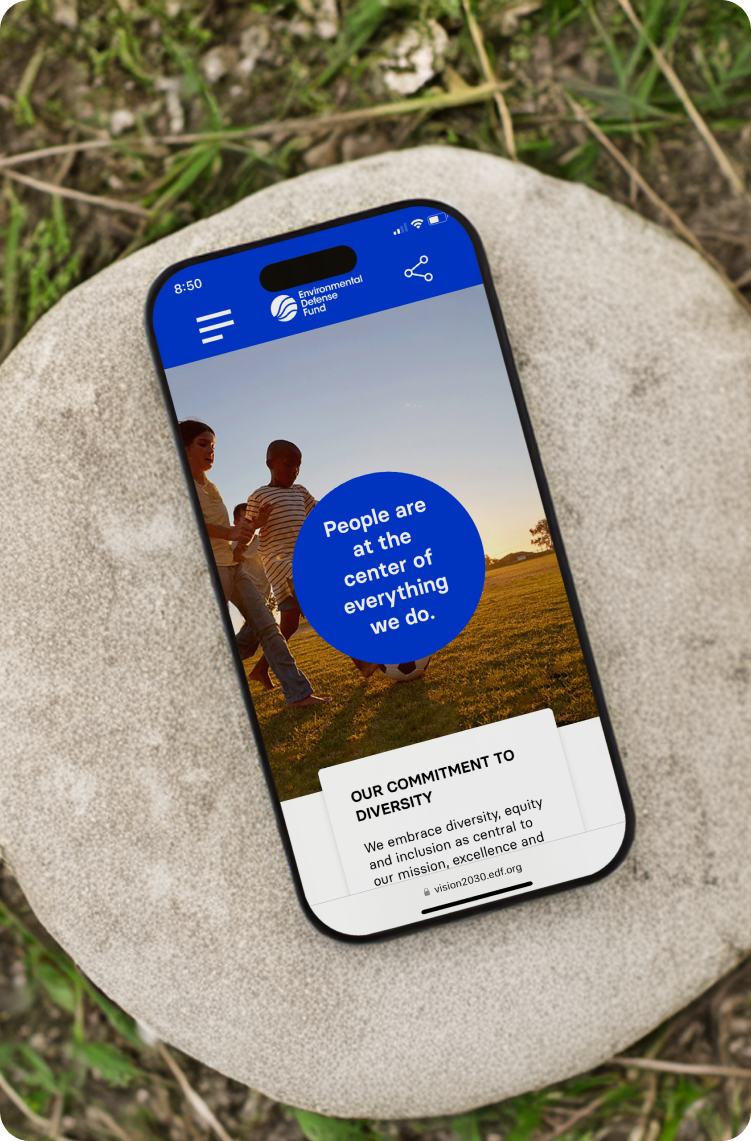 Anchored in EDF's newly refreshed brand identity, we created a bespoke, interactive web experience. The resulting Vision 2030 represents the organization's newly defined online approach—distilling rich information into easy-to-digest visual narratives, employing inventive UX strategies to further engagement and centering human-focused photography with a concentric circle treatment to visually express the ever-expanding impact our actions set in motion.