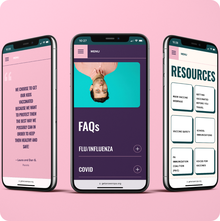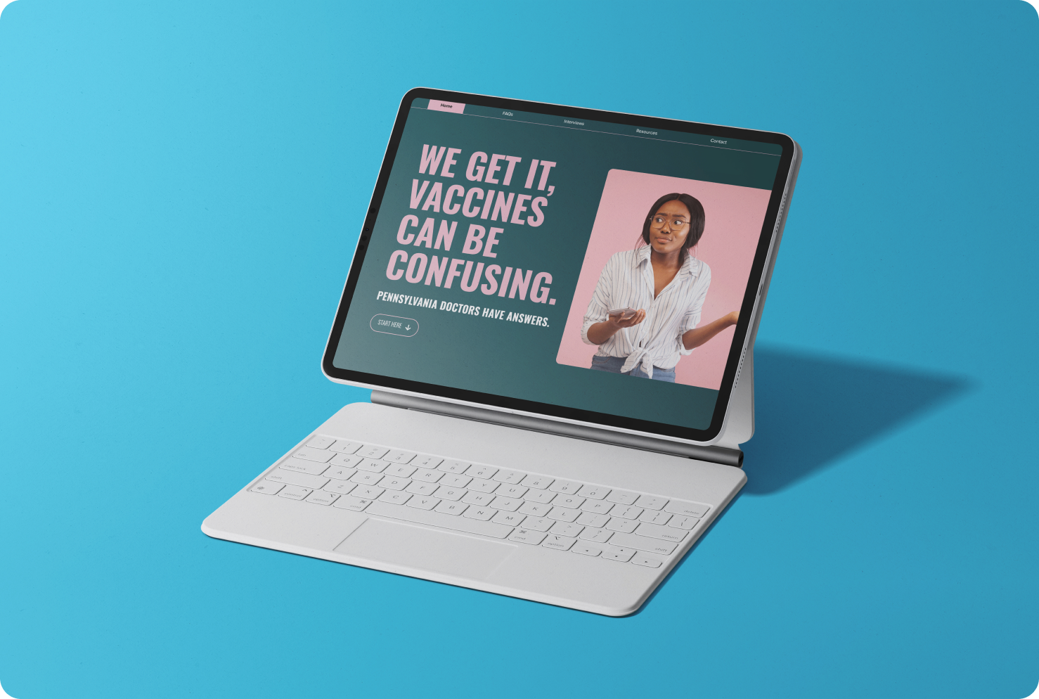 Quirky, attention-grabbing photos and headlines empathetically tapped into parents' sense of confusion and overwhelm surrounding vaccinations, while a thoughtful saturated color palette paired with soft pastels created a natural bridge between the bold visuals and a more nuanced, serious tone. The campaign was disseminated across online video, display and native ads, strategically targeting vaccine-hesitant parents through advanced audience targeting capabilities. Generating more than 26M impressions with PA parents and quickly surpassing industry benchmarks for click-through and video completion rates, viewers landed at GetAnswersPA.org, a simple, intuitive hub for trustworthy information, links, and testimonials.